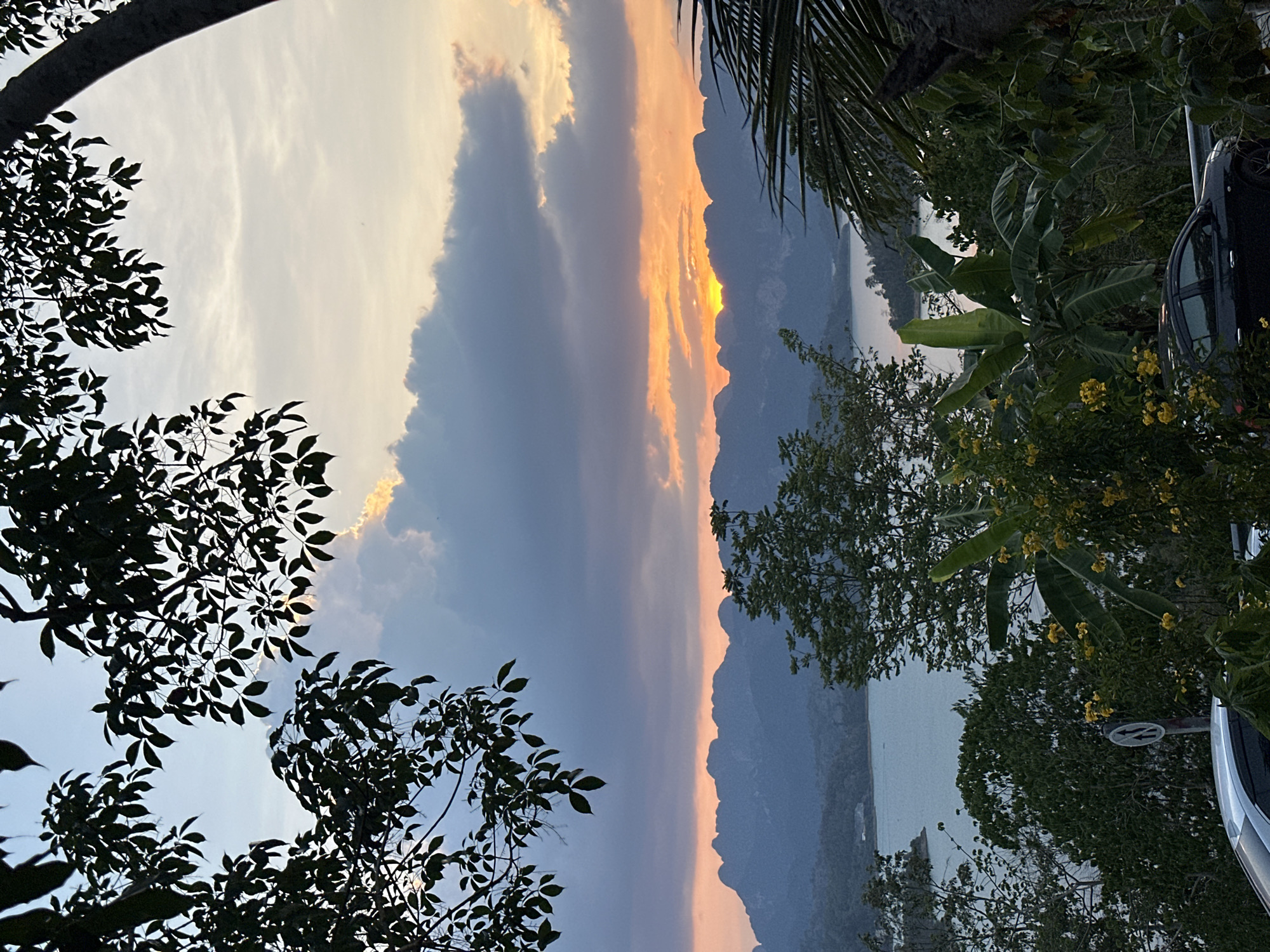 The image captures a sunset view from what appears to be the city of Ban Chiao Lan, Thailand, framed by lush greenery. The sky is a gradient of colors, transitioning from blue to orange and yellow as the sun dips behind the silhouette of distant mountains. There are large clouds filling a portion of the sky, with the sun's light piercing through a gap between the mountains. Foreground elements include tree branches and foliage, some with distinct yellow flowers. A glimpse of a body of water can be seen between the vegetation and the mountain range. Part of a vehicle is visible on the right side of the frame, partially obscured by the surrounding plants. A street sign is also visible by the car.