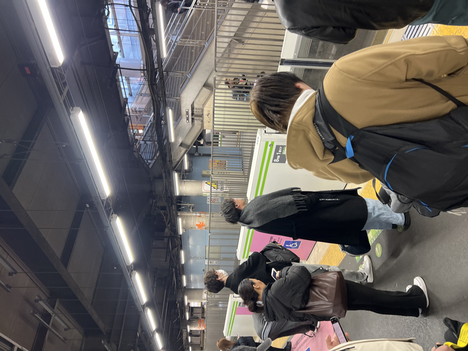 People stand on a train platform, waiting. A man with a brown jacket and backpack faces away from the camera. In front of him stands a man with a black coat. Another person wearing a black coat is in front of them, looking at their phone. The platform has yellow safety lines and pink accessibility signage. Overhead, bright fluorescent lights illuminate the high ceiling with metal beams and structures. A metal staircase is visible in the background.
