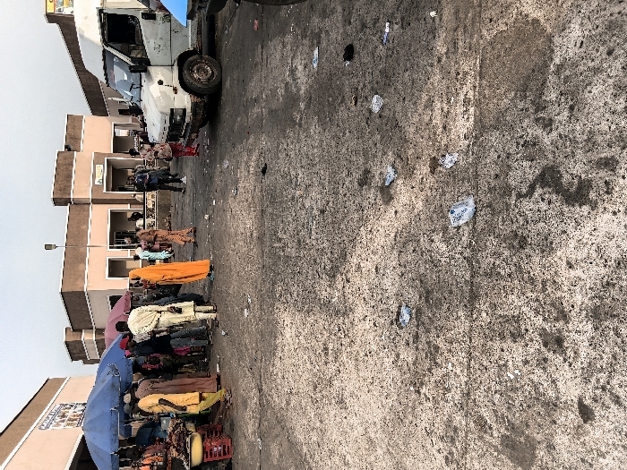 A bustling outdoor market occupies a concrete area next to a two-story building. Various vendors and shoppers are present, with stalls and tents lining the edge. A white truck is parked in the upper section. The ground is littered with small pieces of trash. The building has a simple, rectangular design with distinct horizontal lines and a tan exterior. Light poles provide illumination. The overall scene suggests a lively commercial environment with everyday activity.