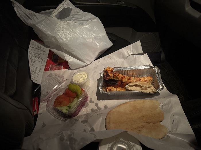 The scene depicts takeaway food arranged on a dark surface, consistent with the interior of a vehicle, in Hadleigh, Babergh, United Kingdom