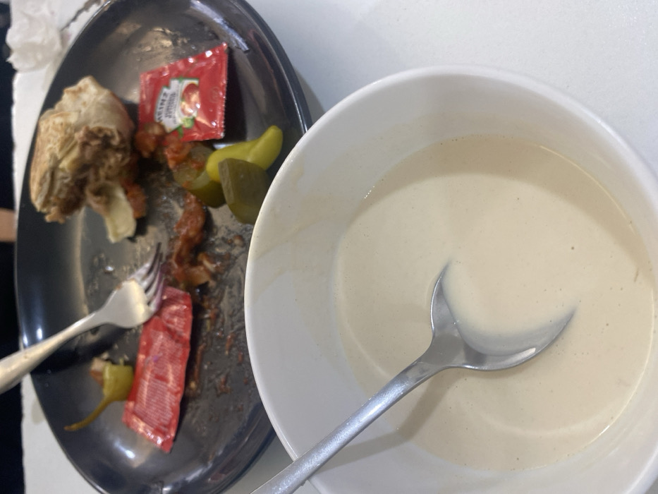 - "The image displays a close-up, high-angle view of a partially consumed meal situated on a light-colored table surface, within Deir el-Balah, Palestinian Territory" by FM-U9GOy1, licensed under CC BY 4.0