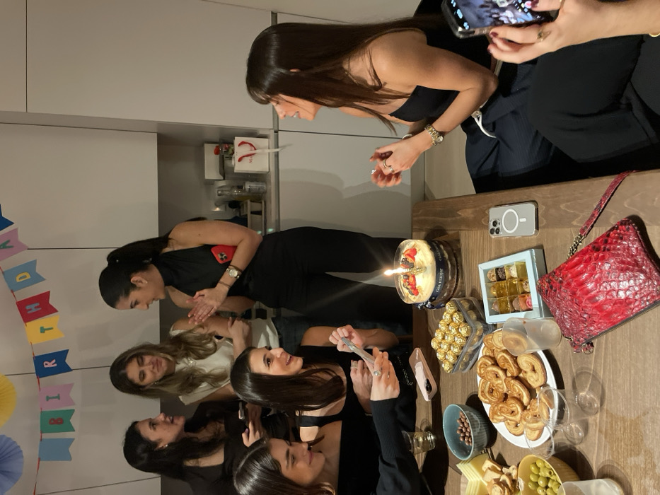 A group of women gather around a wooden table to celebrate a birthday. One woman leans forward to blow out a single candle on a cake. Another woman is taking pictures of the event with a phone. The table is laden with snacks and treats, including a box of chocolates, Ferrero Rocher, puff pastry, olives, and cheese. A red handbag and phone are on the table, adding to the celebratory atmosphere. A "Happy Birthday" banner adorns the background wall.