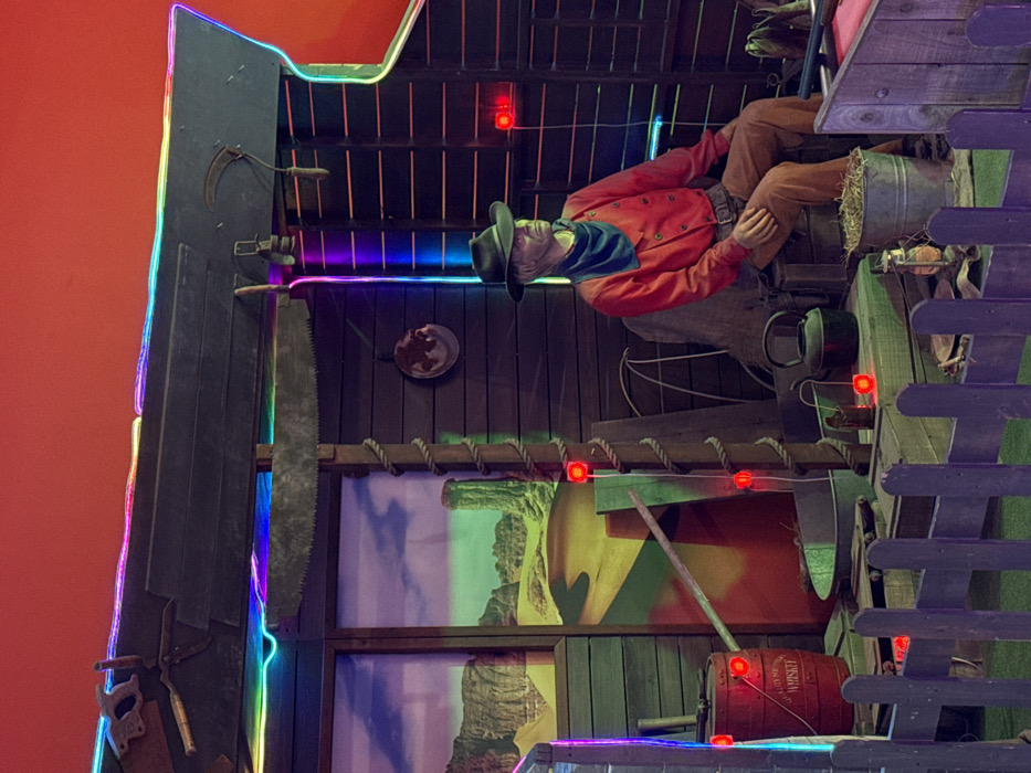 This image depicts a Wild West-themed display located within the Funtopia entertainment complex at Paradise Center in Sofia, Bulgaria. The scene features a male mannequin seated on a wooden crate, positioned slightly right of the frame's center. The mannequin wears a dark cowboy hat, a blue bandana around its neck, a red long-sleeved button-down shirt, and light brown trousers. Its facial expression is neutral, and it gazes towards the left side of the frame. Behind the mannequin is a dark, slatted wooden shed structure with a sloped roof. The roofline and a vertical corner beam are illuminated by multicolored neon strip lighting that transitions through blue, green, yellow, orange, and purple hues. Several small, square red LED lights are intermittently placed on the vertical wooden post wrapped with rope, on the red barrel, and on the shed wall. Suspended from a crossbeam under the shed's roof are two large, antique-style hand saws. A scythe and another smaller saw are hung on the shed's right side, while a round metal pan is affixed to the wall on the left. Two rectangular openings on the left portion of the shed display desert landscape backdrops, featuring stylized rock formations and sand dunes in shades of blue, green, and yellow. On the ground level, from left to right, a red wooden barrel labeled "OLD KENTUCKY WHISKEY" with a spigot is visible. A black kettle with a handle rests on a wooden surface, next to a grey metal bucket filled with straw or hay. A lantern is also present near the bucket. Various other small, rustic objects are scattered on the ground. A low, dark wooden picket fence runs across the immediate foreground, partially obscuring the lower portion of the display. The entire environment is indoors, characterized by low ambient light augmented by the vibrant neon and red LED illumination, set against a red-painted background wall or ceiling.