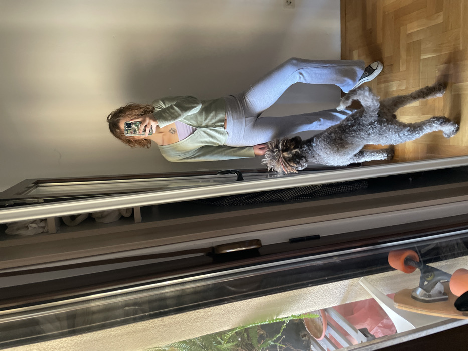 An indoor scene in Boreti, Montenegro, features a female subject and a dog captured in a full-length mirror selfie
