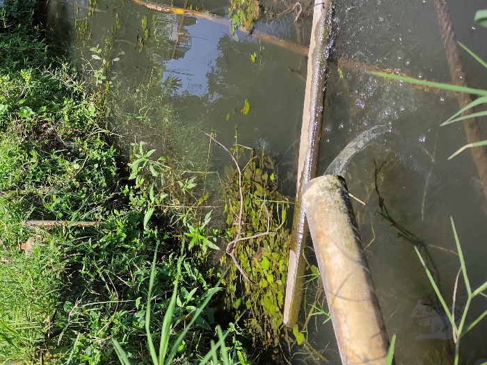 The image displays an outdoor scene in Nieste, Germany, focusing on a murky water channel heavily bordered by dense green vegetation under bright sunlight. A light-colored, possibly concrete or PVC, pipe protrudes from the lower-left foreground into the water, actively discharging a stream of water that creates ripples and bubbles on the surface. Parallel to this, and partially submerged further into the channel, is a weathered, elongated object, potentially a wooden plank or another pipe. The water is dark and reflective, dotted with small patches of green aquatic plants. The banks are overgrown with a variety of lush green foliage, including tall grasses and broad-leafed plants. No individuals or specific urban structures are visible within the frame, which primarily depicts a natural or semi-natural waterway.