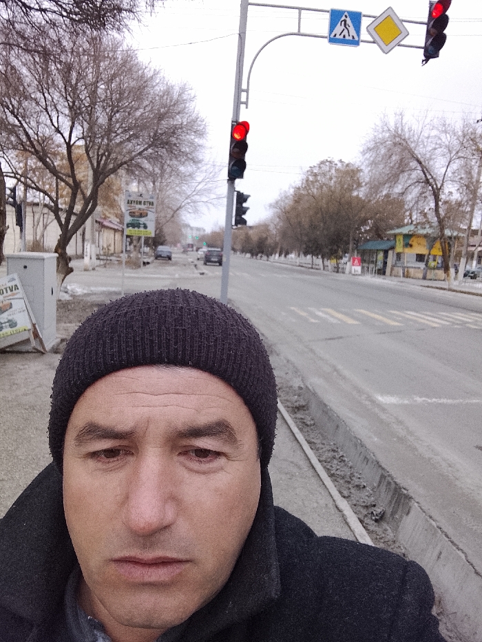 A man wearing a dark beanie and coat takes a selfie. He stands near a street with a red traffic light and pedestrian crossing signs. Trees line the street, and buildings are visible in the background. The sky is overcast.