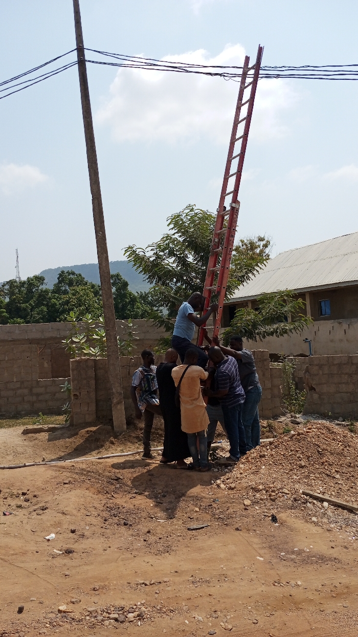 In Adankolo, Nigeria, a group of seven adult males is engaged in a task involving a tall, red two-section extension ladder
