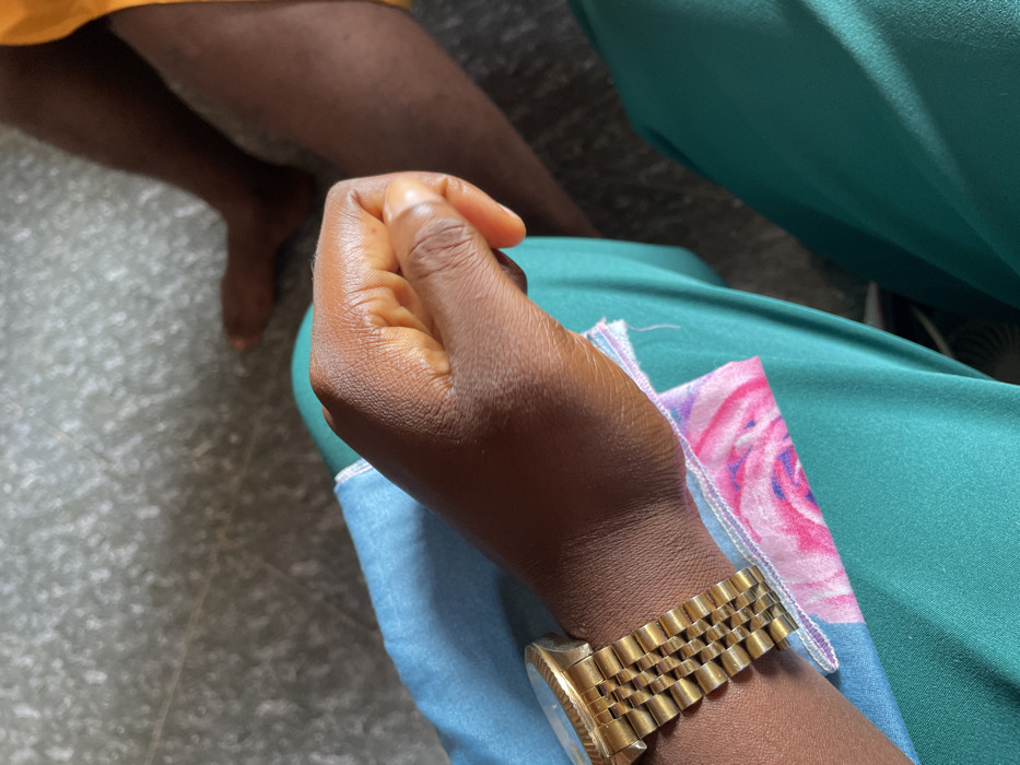 The image depicts an overhead perspective of an individual's left arm and hand, clenched into a partial fist. The subject's skin is dark-toned. A gold-colored wristwatch with a metallic link band is present on the left wrist. The individual wears a teal or dark green garment, with a visible light blue fabric underneath featuring a pink and purple floral pattern. To the right of the frame, the bare, dark-toned legs and feet of a second individual are visible, clad in yellow shorts. Both individuals are positioned over a light gray, textured floor surface, possibly concrete. Direct sunlight illuminates parts of the scene, creating distinct shadows. This scene is located in Markurdi, Nigeria.