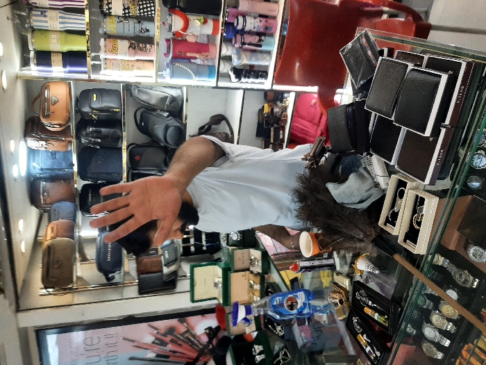 This image depicts the interior of a retail shop located in Barza Municipality, Syria. In the foreground, a male individual with dark hair and a beard, wearing a light-colored t-shirt, is visible from the chest up, with his right hand raised, palm outward, obscuring part of his face. The scene centers around a glass display counter. Inside the counter, multiple wristwatches are exhibited. On the surface of this counter, from left to right, are a blue bottle of "Astonish" glass cleaner, an orange paper cup, a feather duster, a light blue cloth, a small dark-colored revolver-style handgun, several lighters including a gold-colored Zippo-style lighter and a black rectangular one, multiple open and closed boxes containing keychains or small accessories, a white cigarette pack, and several stacks of black leather wallets, some presented in white boxes. In the background, overhead shelves display various merchandise. The upper shelves on the right feature an assortment of men's and women's bags, including shoulder bags, messenger bags, and clutches, in different colors and materials. Below these, additional shelves are stocked with numerous insulated tumblers and mugs, distinct in color and pattern. To the far left background, a vertical display holds an array of brushes, alongside green watch boxes and other small accessory displays. The environment suggests an organized retail space with artificial lighting. A red chair is partially visible on the far right.