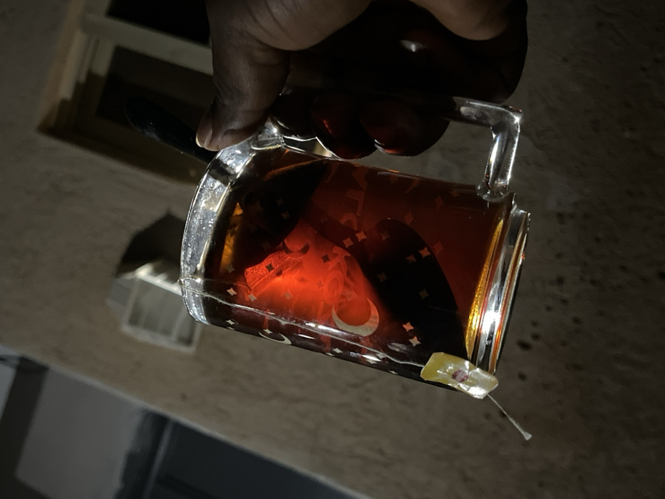 A close-up, slightly upward-angled shot depicts a dark-skinned hand gripping the clear handle of a glass mug. The mug contains a dark amber liquid, identified as tea by a submerged tea bag with a white string leading to a yellow rectangular tag hanging outside the mug. The glass mug is decorated with light-colored crescent moons, stars, and partial Arabic script. A dark spoon is partially submerged within the liquid, with its handle extending upwards. The background is dimly lit, revealing a textured, light-colored wall with an architectural feature, possibly a vent or light fixture, and a dark opening consistent with a window or doorway. The image contains no verifiable visual information to confirm the location as Gura Top, Nigeria.
