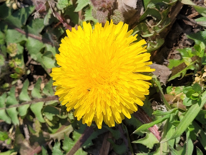- "A close-up photograph captures a single, vibrant yellow dandelion flower (Taraxacum officinale) in full bloom, positioned centrally within a densely vegetated ground cover in Cherven Bryag, Bulgaria" by FM-laGG22, licensed under CC BY 4.0