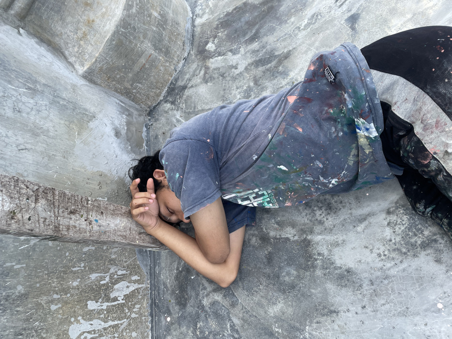 A person lies curled within a concrete structure. The individual rests their head on their hands, eyes closed. They wear a paint-splattered grey t-shirt and dark pants. The surrounding concrete is marked with streaks and spots of paint. The structure curves around the person, enclosing them within its gray, textured surface.