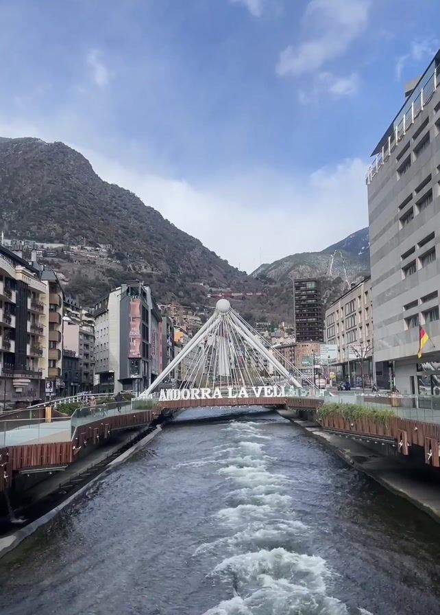 The video showcases a scenic view of Andorra la Vella. A river flows rapidly through the center of the frame, with a pedestrian bridge spanning it. The bridge has a distinctive white structure with "ANDORRA LA VELLA" written across it. Buildings line both sides of the river, and mountains form the backdrop. The sky is partly cloudy. A lone person is walking along the walkway on the left side of the river. A German flag is visible on one of the buildings. The overall setting is an urban environment nestled within a mountainous region.