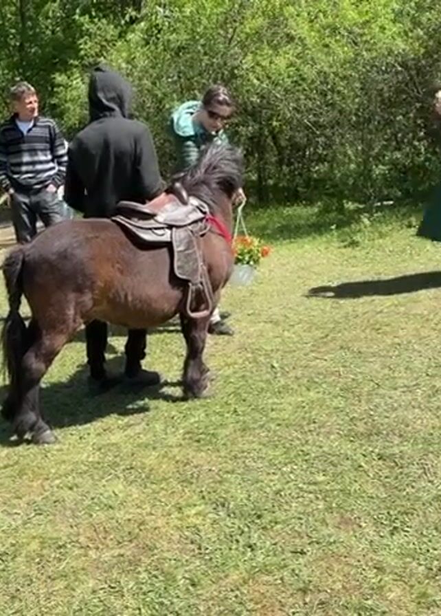 small, brown, pony standing on a grassy lawn surrounded by people. The pony has a saddle on its back, and a white pail filled with red and orange flowers is attached. One person, wearing a black hooded sweatshirt, is standing close to the pony. Two other people are standing next to them, one holding the pony's lead rope. A woman in a long green coat is standing nearby, taking pictures with her phone. Several other people are sitting on hay bales in the background. A child is standing near a man in a striped shirt. The background shows a wooded area with green trees and sunlight filtering through the leaves. The weather appears to be sunny and clear.