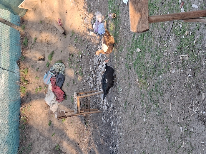 The image depicts an outdoor, unpaved area in Moshtanets, Bulgaria, under natural light. The ground is a mix of sparse green grass and bare dirt, littered with wood fragments, feathers, and miscellaneous debris. Two ducks are present on the ground. A large, predominantly black Muscovy duck with white wing markings and a reddish facial caruncle is positioned left of center, facing right. To its right, a smaller, brown and tan duck is situated, facing left. Both appear to be foraging or resting. In the mid-ground left, a dilapidated wooden chair, missing its seat and portions of its backrest, stands upright on the dirt. Behind this chair, on a dirt embankment, lies a pile of various fabrics, including white, red, blue-striped, and camouflage patterns. The embankment is topped by a blue-green mesh fence, partially shaded. Near the brown duck, a discarded gold-colored aluminum beverage can and crumpled white plastic refuse are visible on the ground. The backrest and two vertical supports of a second wooden chair are partially visible in the lower right foreground. Shadows indicate a low sun angle from the left.