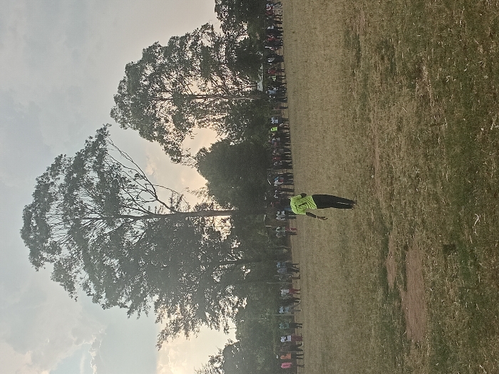 A person in a bright green shirt and dark pants is lying on a grassy field. Trees dominate the background, with their canopies filling much of the upper half of the image. A crowd of people stands along one side of the field, appearing as a line of indistinct figures. The sky is visible between the trees, suggesting an outdoor setting, possibly a park or sports field.