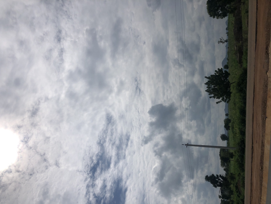 The image depicts an outdoor, undeveloped landscape, presented as being in Abobo, Nigeria. The upper two-thirds of the frame are dominated by a heavily overcast sky, filled with dense, grey and white stratocumulus clouds. A bright, obscured light source, consistent with the sun, is visible in the upper left corner through the cloud cover. Patches of lighter blue sky are visible beneath the thicker cloud formations. The middle ground features an expansive green field or cultivated land, sparsely dotted with various trees of differing heights and foliage density, appearing dark against the lighter green vegetation. A single, slender concrete utility pole stands vertically in the left-center, extending upwards into the sky, with multiple black electrical or communication wires stretching horizontally from it across the frame. In the distant background, dark, hazy hills or mountains are visible along the horizon line. The foreground consists of a reddish-brown, unpaved or dirt road surface, running horizontally across the bottom section of the image. Immediately in front of this, a narrower strip of darker, possibly more compact ground or another road surface is visible. No individuals, vehicles, or prominent structures other than the utility pole and road are present.
