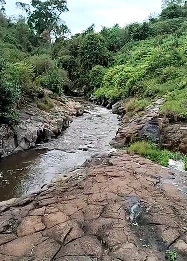 river flowing through a rocky, forested area. The water is moving and clear. The rocks are textured and brown. The trees are green and dense. The sky is overcast.