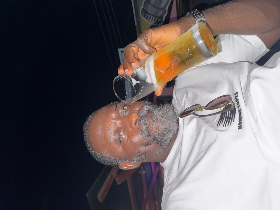 An older Black man with graying hair and a beard holds a beer glass with golden liquid over his head. He is wearing a white t-shirt with sunglasses perched on the chest. His wrist bears a silver watch. The background is dark with some blurry lights and what looks like an outdoor setting. The image is rotated ninety degrees counterclockwise.