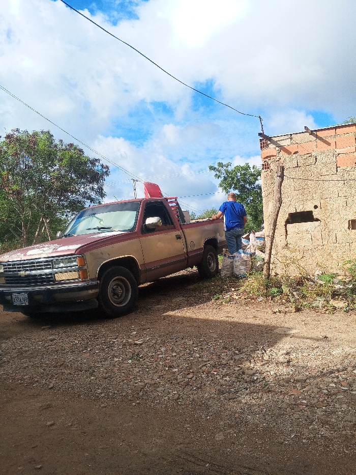 A tan and maroon Chevrolet pickup truck is parked on a dirt road. A man in a blue shirt stands near the truck's bed, close to a pile of bagged items. The scene includes a partially constructed brick and clay building to the right of the truck, with exposed roof beams. Overhead power lines stretch across a blue sky with scattered clouds. Trees and vegetation are visible in the background.