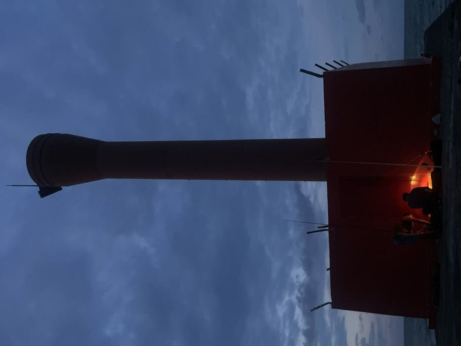 - "The scene, set at dusk or night in Lhokseumawe, Indonesia, features a tall, reddish-brown cylindrical structure, possibly a lighthouse or a chimney, atop a rectangular red base on a concrete pier or breakwater" by FM-56aBo1, licensed under CC BY 4.0