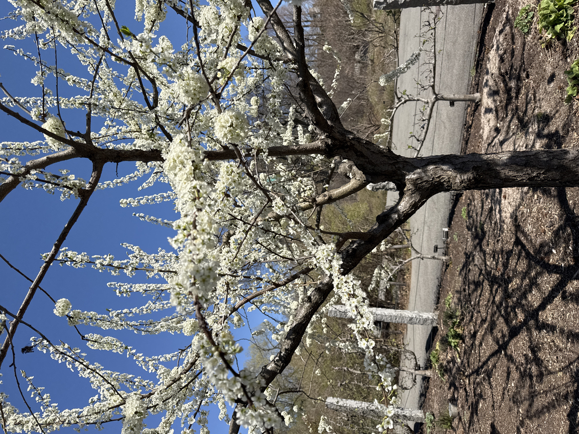 A flowering tree with white blossoms is prominently featured against a clear blue sky. The tree's branches extend outwards, laden with clusters of small, white flowers. The tree's trunk is sturdy and rough, with visible texture. In the background, a paved path winds through a park-like setting. Other trees are visible along the path, also beginning to bloom. The ground is covered in mulch or dirt, with patches of grass and greenery. Shadows from the trees fall across the ground. The scene appears to be taken in a park in New York City, United States.