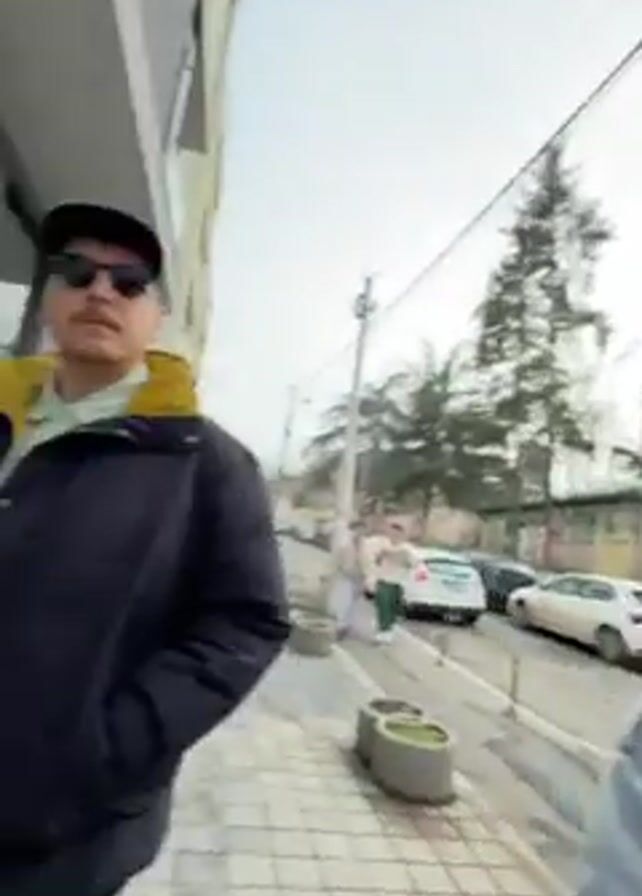 A woman in a grey trench coat and oval sunglasses takes a selfie video while walking down a city street. A man with a mustache, wearing sunglasses, a black baseball cap, and a black jacket with a yellow collar walks alongside her. Cars are parked on the street, and trees and buildings are visible in the background. The day appears overcast.