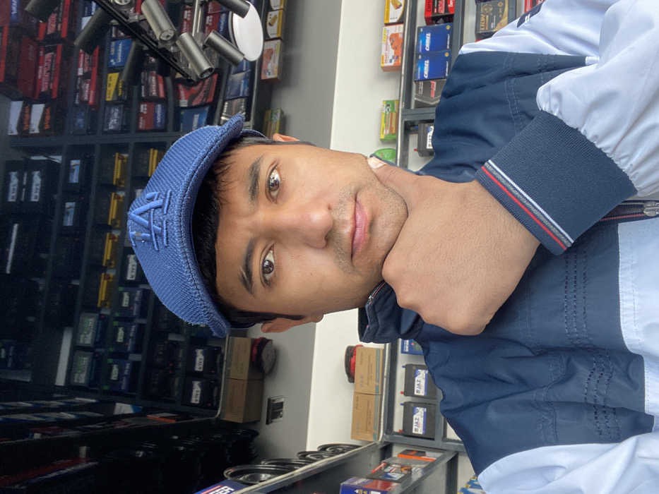 A male individual is depicted in a medium-shot selfie, positioned centrally within a retail environment