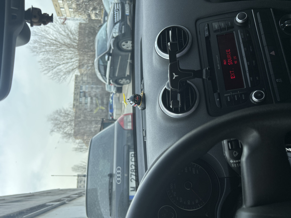 The image depicts a first-person perspective from the interior of an Audi vehicle, looking forward through the windshield onto an urban street in Sofia, Bulgaria, under an overcast sky. In the immediate foreground, the grey dashboard of the vehicle is visible, featuring an "Audi concert" car stereo displaying "EXT. SOURCE" and "15:26". A black phone holder is mounted centrally on the air vents. To the left, a portion of the black steering wheel and the vehicle's instrument cluster are visible. A black rubber duck figurine, wearing sunglasses and a propeller hat, with a gold chain, sits on the dashboard near the windshield base. A small, dark wooden charm hangs from the interior rearview mirror assembly, partially visible at the top center. Outside the vehicle, a dark grey Audi A3 hatchback (B6 generation) is parked directly ahead, displaying Bulgarian license plate "M 2782 CP". Its rear window appears wet. To the right of the Audi, a dark grey Mercedes-Benz ML-Class SUV (W164 generation) is partially visible, also parked, with a Bulgarian license plate starting "B 9556". In the background, other indistinct vehicles are visible in a parking area. The environment includes multi-story residential buildings, consistent with typical Bulgarian urban architecture, particularly prevalent in Sofia. A light-colored building runs parallel to the left of the Audi. Bare trees, indicative of cooler weather, are scattered throughout the scene. A construction crane is faintly discernible in the far background on the right. No individuals are visible in the scene.