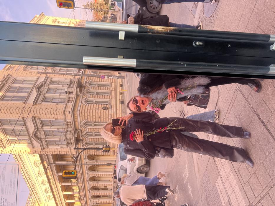 Two young women are reflected in a glass surface, likely a shop window or mirror, on a city street in Sofia, Bulgaria, during golden hour. The prominent background building, seen in reflection, is the neoclassical facade of the Sofia University "St. Kliment Ohridski" Rectorate, characterized by its light-colored stone, multiple stories, ornate windows, and architectural details. The woman on the left, with short blonde hair and dark rectangular sunglasses, wears a dark turtleneck, a black peacoat-style jacket, black leather-like trousers, and dark shoes. She holds a black smartphone up, appearing to take a selfie, and cradles several red carnations in her left arm. The woman on the right, partially obscured by a dark vertical pillar with two horizontal chrome handles, has dark hair and wears oval-shaped sunglasses, a dark coat, a grey faux-fur scarf, dark trousers, and dark red/brown chunky boots. She holds a bouquet of pink flowers, possibly carnations, in her left hand, and her mouth is open wide in an expressive grimace. She carries a dark handbag with light-colored patterns. The street in the background shows pedestrian activity, a silver hatchback vehicle, and a dark sedan. Traffic lights are visible, with a green signal on the left and a red signal on the right. The sky exhibits a warm, clear hue, indicative of late afternoon or early morning light. A white sign with Bulgarian text is visible at the upper left but is illegible.