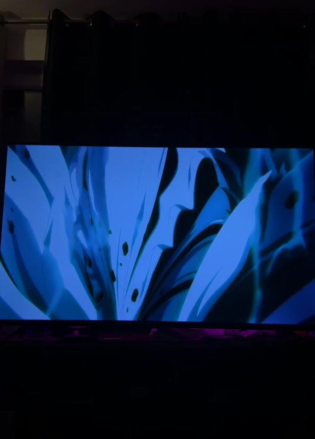A television screen displays an animated scene with dynamic, brightly colored visuals