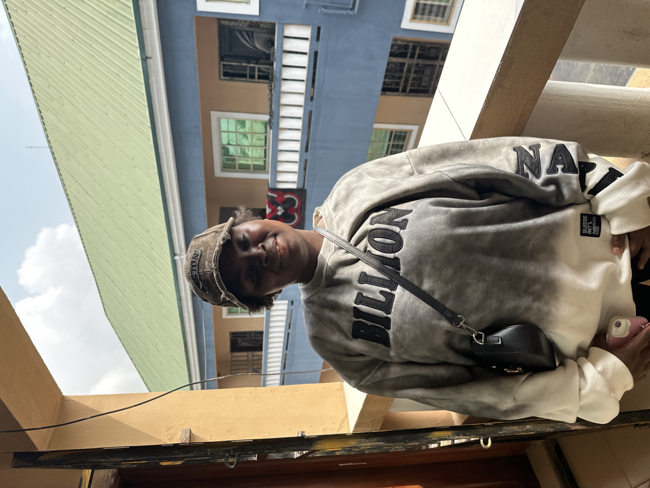 A young adult female with dark skin and short dark hair is shown standing on a balcony, facing the camera and smiling. She wears a distressed brown baseball cap with "BOSTON" visible on the front, and an oversized grey and white gradient sweatshirt featuring "BILLION" in raised black letters across the chest. A small black cross-body bag hangs from her left shoulder, and she holds a light pink smartphone in her left hand. The background reveals a two-story blue building with a light green corrugated metal roof, typical of structures in Oyigbo, Nigeria. This building has multiple windows with dark frames and light green tinted glass; some windows are fitted with security bars. A patterned red and black textile hangs over a white railing on the upper floor of the background building. The sky above is light blue with scattered white clouds.