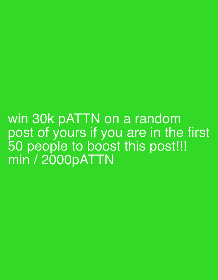 The image displays white text centered against a solid, vibrant green background. The text reads: "win 30k pATTN on a random post of yours if you are in the first 50 people to boost this post!!! min / 2000pATTN". No physical location, individuals, objects, or environmental details from the city of Höri, Switzerland, are depicted within the image. The scene is entirely textual and digital, with no discernible actions or interactions visually represented.