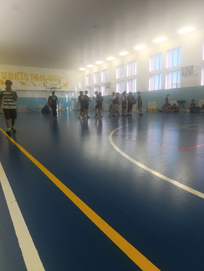 Inside a brightly lit gymnasium, a group of people gathers on a blue basketball court with yellow and white lines. Some individuals are in athletic wear, possibly basketball players, while others sit along the wall. A basketball hoop stands against the wall, which is decorated with the word "UZBEKISTAN." Windows line the upper portion of the wall, letting in natural light.