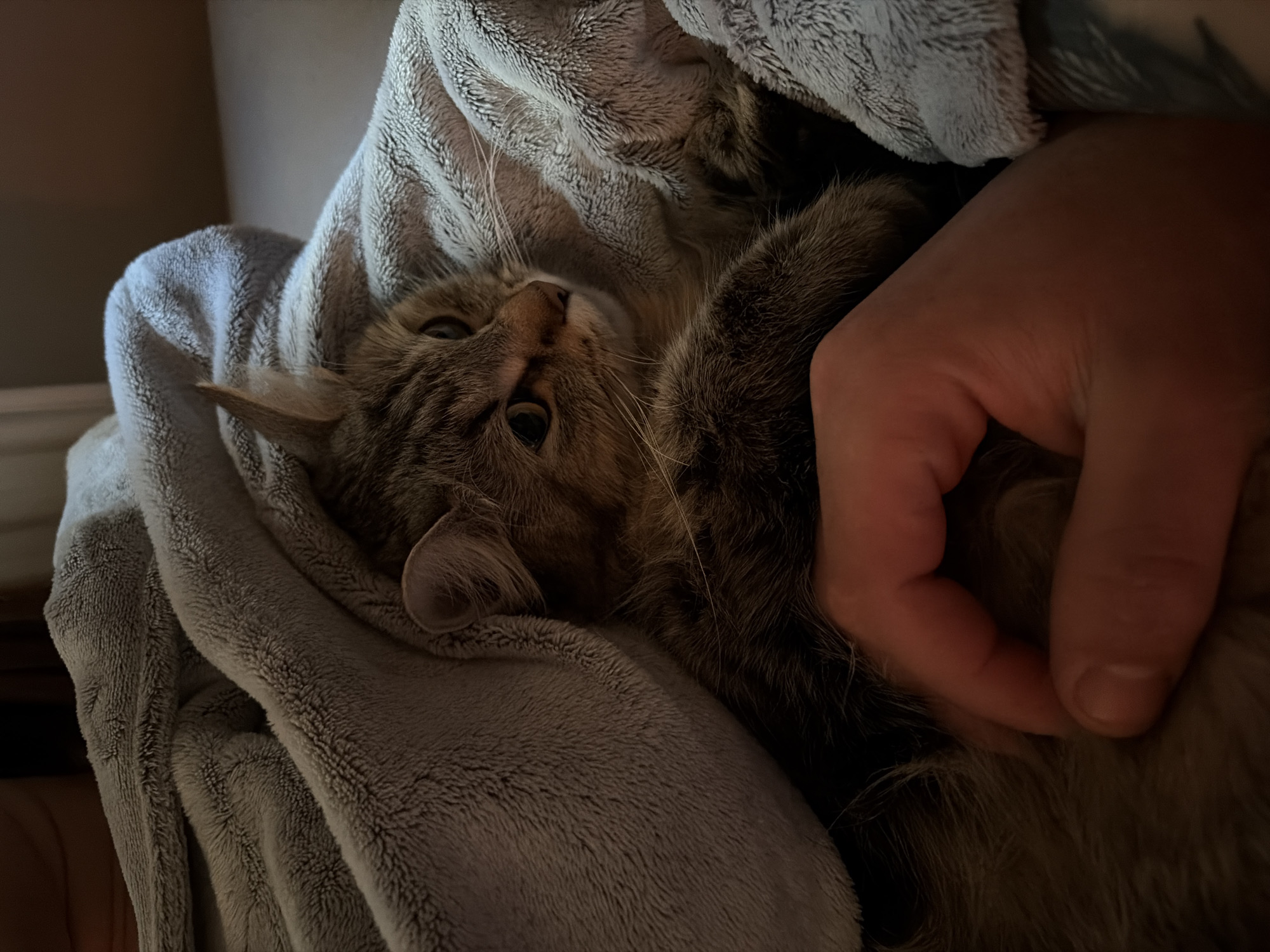 A brown tabby cat with amber eyes is nestled in a gray, plush blanket, partially obscured. A human hand is present near the cat, appearing to interact with it. The lighting suggests an indoor setting. The location, Antwerp, Belgium, is not visually discernible from the image.