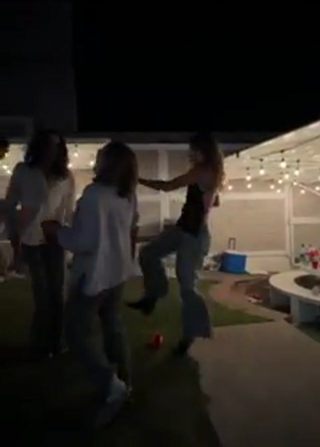 Several young adults are dancing in a backyard at night. The backyard has grass and a concrete patio. String lights are hanging above the patio. There is a white wall in the background. There are red cups on a low concrete structure. Some of the people are holding drinks. A speaker is visible near the white wall.
