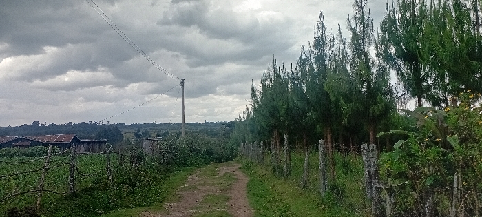 The image depicts a rural landscape in Gatakaine, Kenya, under an overcast sky with heavy grey clouds. A narrow, unpaved dirt path occupies the center foreground, leading into the midground. To the left of the path, green vegetation and sparse ground cover are visible, bordered by a rustic fence constructed from wooden posts and wire. On the right side of the path, a dense row of tall, slender evergreen trees, possibly cypress or pine, forms a natural barrier, also paralleled by a similar wooden post and wire fence. In the midground, towards the left, a light-colored utility pole with multiple power lines extending horizontally is positioned. Beyond the foreground fences and vegetation, to the far left, several structures with corrugated metal roofs and wooden walls are discernible, nestled amidst more distant foliage. The background on the right features an expansive, gently rolling landscape covered with trees and vegetation, receding into the horizon. No individuals are present within the scene.