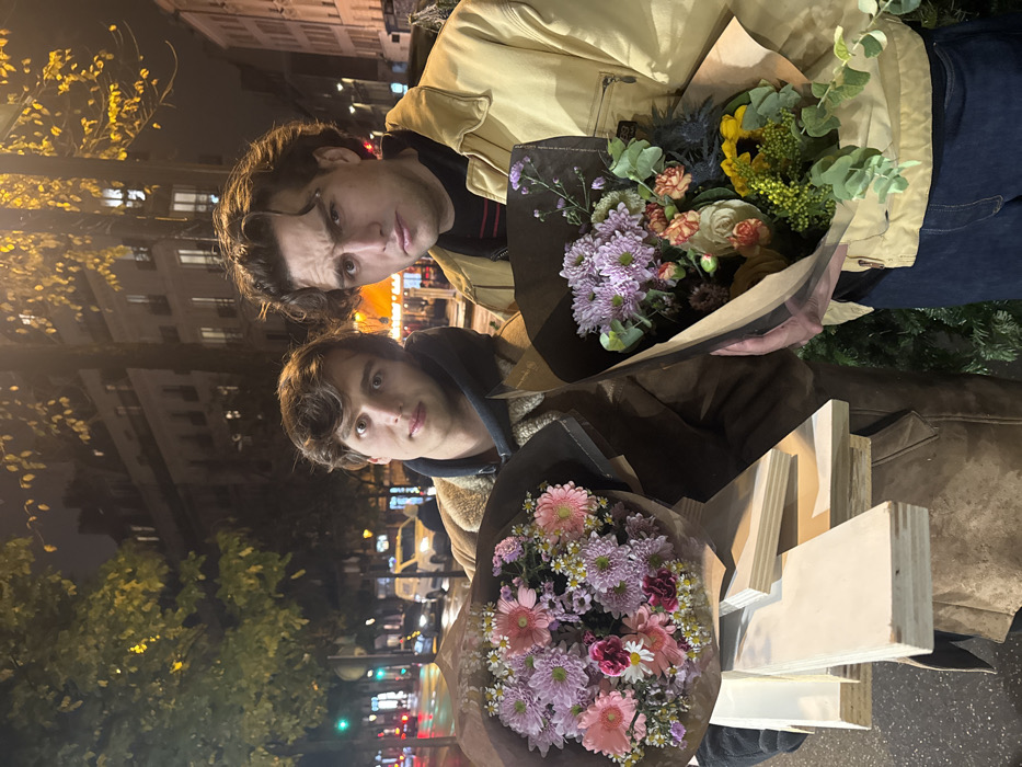 Two young men pose with bouquets of flowers at night. The upper man wears a tan jacket and holds a bouquet with sunflowers and purple flowers. The lower man, wearing a brown jacket, holds a bouquet primarily featuring pink and purple flowers. Stacks of white, rectangular objects are next to him. Background details include street lights, trees, and buildings. The photo has a tilted angle.