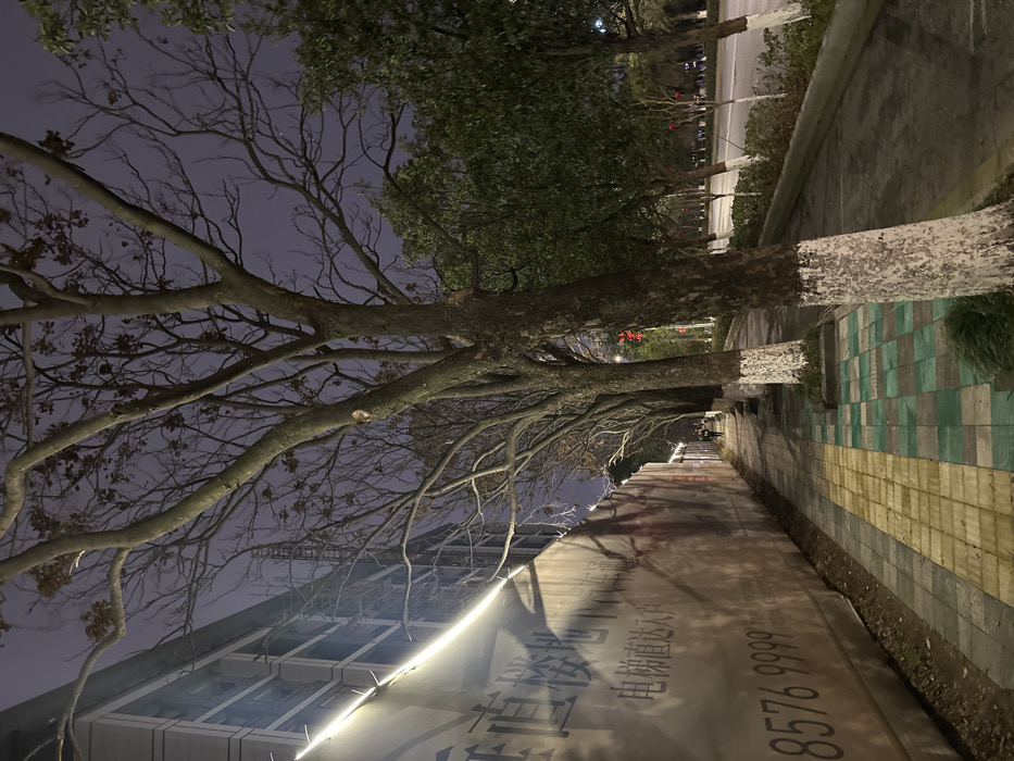 The image depicts a nighttime urban scene in Yiwu, China. A paved sidewalk extends from the foreground into the distance on the left, running parallel to a multi-lane asphalt road on the right. On the far left, a tall, light-colored hoarding or wall features dark Chinese characters and numbers, including "8576 9999," suggesting construction or advertising. A string of bright white LED lights illuminates the upper portion of this wall, casting diagonal shadows. Above the hoarding, a modern building with large windows is partially visible against the dark sky. The sidewalk consists of distinct paving sections: a textured yellow tactile strip, followed by a section of green and gray checkered pavers, and a simpler gray stretch closer to the wall. A row of mostly bare, deciduous trees with white-painted lower trunks lines the sidewalk. Beyond these, closer to the road, a second row of evergreen trees with dense foliage is present. The asphalt road to the right is dark and appears to reflect ambient light, possibly indicating moisture. Reddish-orange streetlights are visible in the distance along the road. Two human figures, appearing as dark silhouettes, are walking away from the viewer on the sidewalk in the mid-ground. The sky is dark, indicating night, with diffused ambient light present.