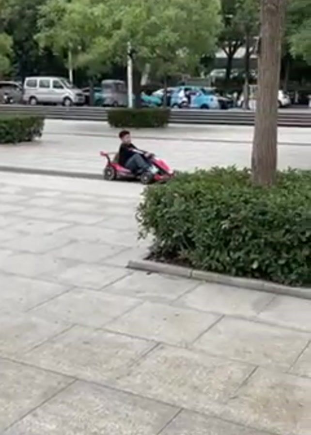 person driving a small red and black go-kart around a public plaza. The plaza has grey paving stones and trimmed bushes. The go-kart driver navigates around bushes and trees. A street with cars is visible in the background.