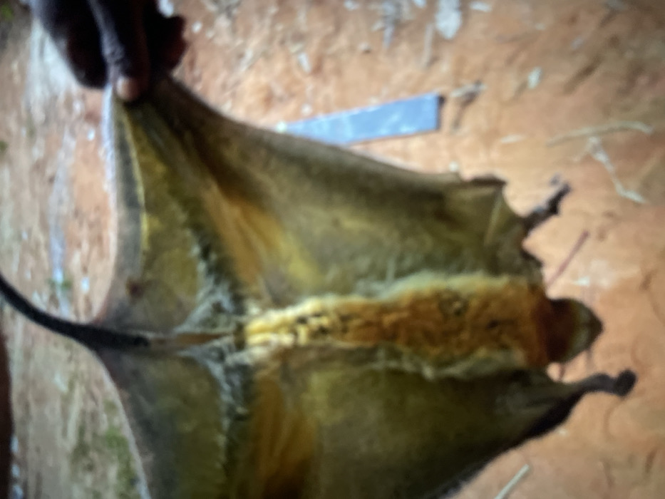 A dark-skinned hand holds a deceased bat. The bat is light brown with visible fur on its body. Its wings are stretched out, displaying their membrane structure. The background features a blurry reddish-brown surface, suggesting dirt or soil. A rectangular metal object sits nearby.