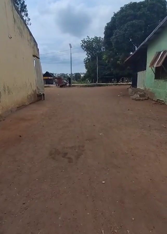 dirt road in a rural area. The road is flanked by buildings on either side. The building on the left is a light-colored, weathered structure with a torn white tarp hanging from it. The building on the right is green with a metal roof and shuttered windows. In the distance, a small group of people appear to be gathered. A solar powered street light stands further down the road. A large tree sits in the background to the right. The sky is cloudy.