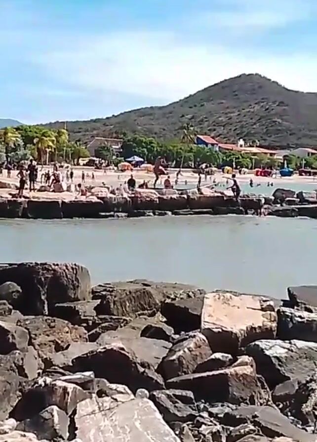 beach scene with a rocky breakwater in the foreground. People are visible swimming and jumping off the breakwater into the water. In the background is a sandy beach with more people, trees, and some buildings, with a large hill visible in the distance under a blue sky with some scattered clouds. The camera is stationary and focuses on the activities around the breakwater.