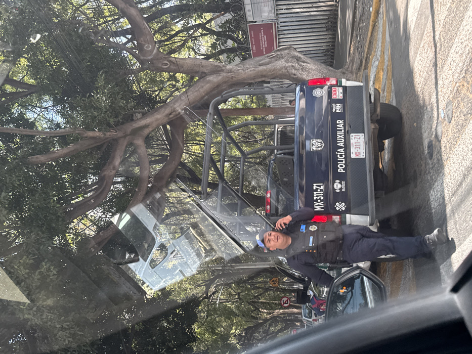 A daytime scene in Mexico City, Mexico, depicts a male auxiliary police officer standing on an asphalt street, observed from within a vehicle