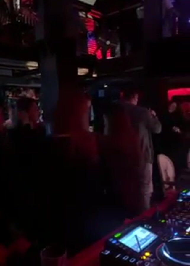 nightclub interior with a DJ booth in the foreground and a crowd of people dancing in the background