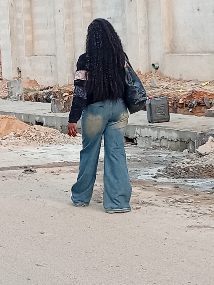 A person with long, dark, curly hair is facing away from the camera. They are wearing a black jacket with lighter panels, blue wide-leg jeans with some dirt marks, and are carrying a black bag over their shoulder. The surroundings suggest a construction site or undeveloped area, with piles of dirt and concrete structures in the background. A rectangular can labeled "25" sits on a low concrete wall. The ground appears to be a dirt road or pathway.