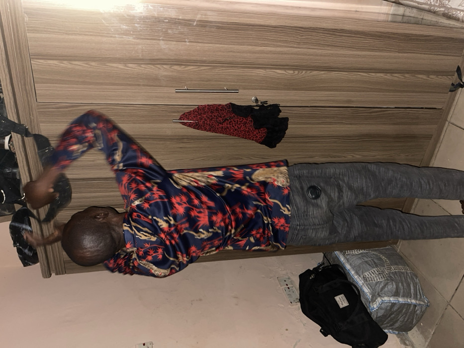 An adult individual, viewed from behind, stands indoors in Unguwar Gabas, Nigeria, reaching upwards with both hands towards the top of a light-brown, wood-grain wardrobe. The person is wearing a long-sleeved dark blue shirt patterned with red and tan designs, and dark grey patterned trousers. Their arms are blurred, indicating motion while handling a dark object at the top of the wardrobe. The wardrobe features two doors with vertical silver handles; a red and black patterned garment hangs from the right handle. To the left, a light-colored wall with two white electrical outlets is visible. On the floor, a black bag rests atop a large, grey and white striped woven sack. The floor is tiled.