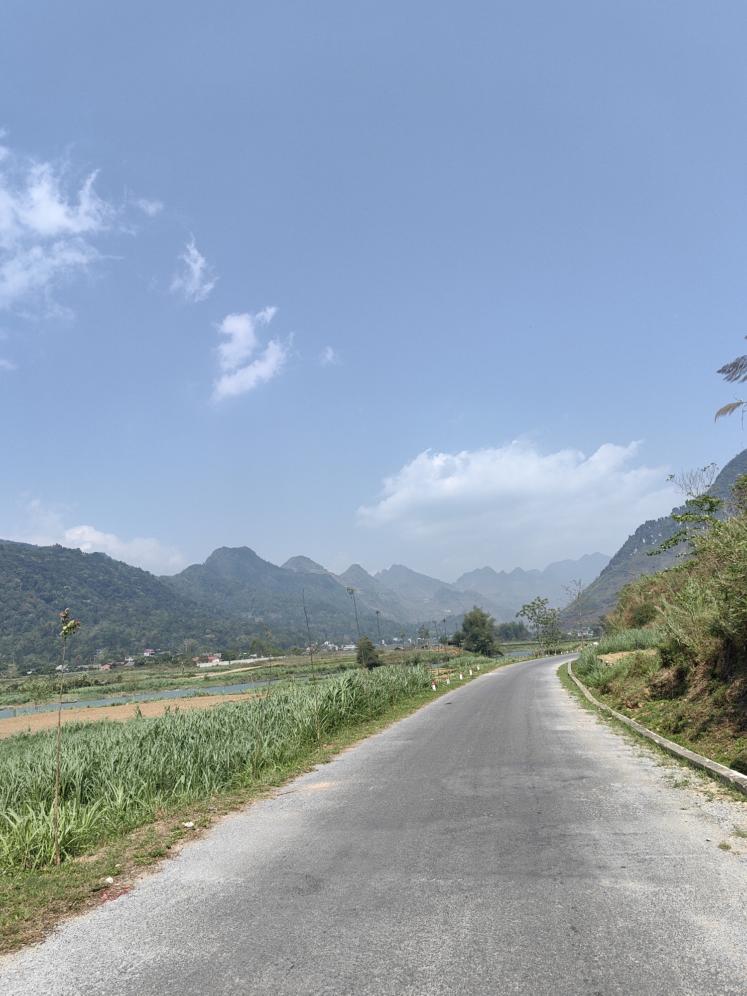 The image captures a gray asphalt road curving to the right within Lùng Tám Commune, Vietnam