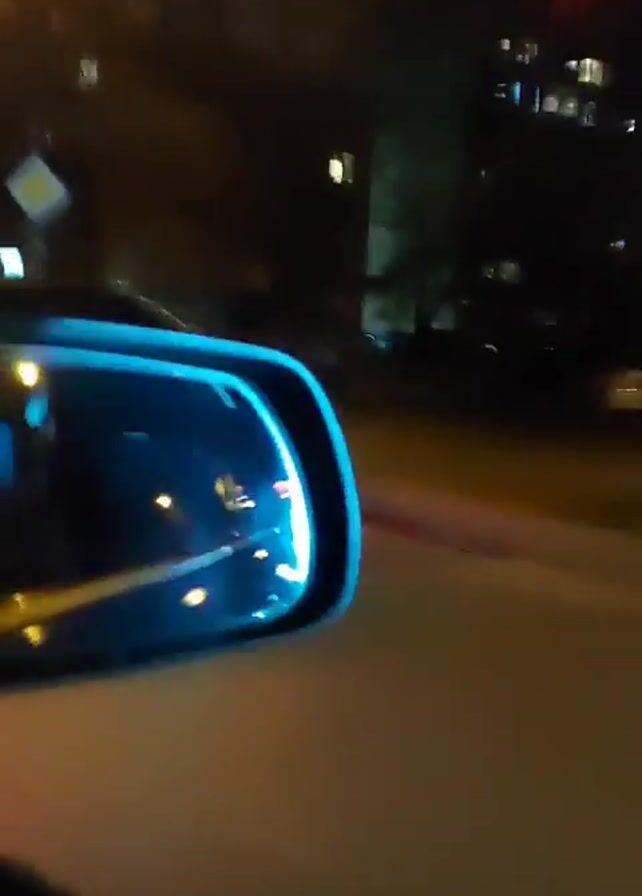 A nighttime scene shows a chartreuse Dodge Challenger Hellcat traveling on a city street. The video is shot from inside another vehicle following behind it. Street lights illuminate the road and surrounding buildings. The Challenger has black graphics on its rear quarter panels. The camera briefly captures the Challenger’s reflection in the driver’s side mirror. The Challenger's tail lights are illuminated as it drives.