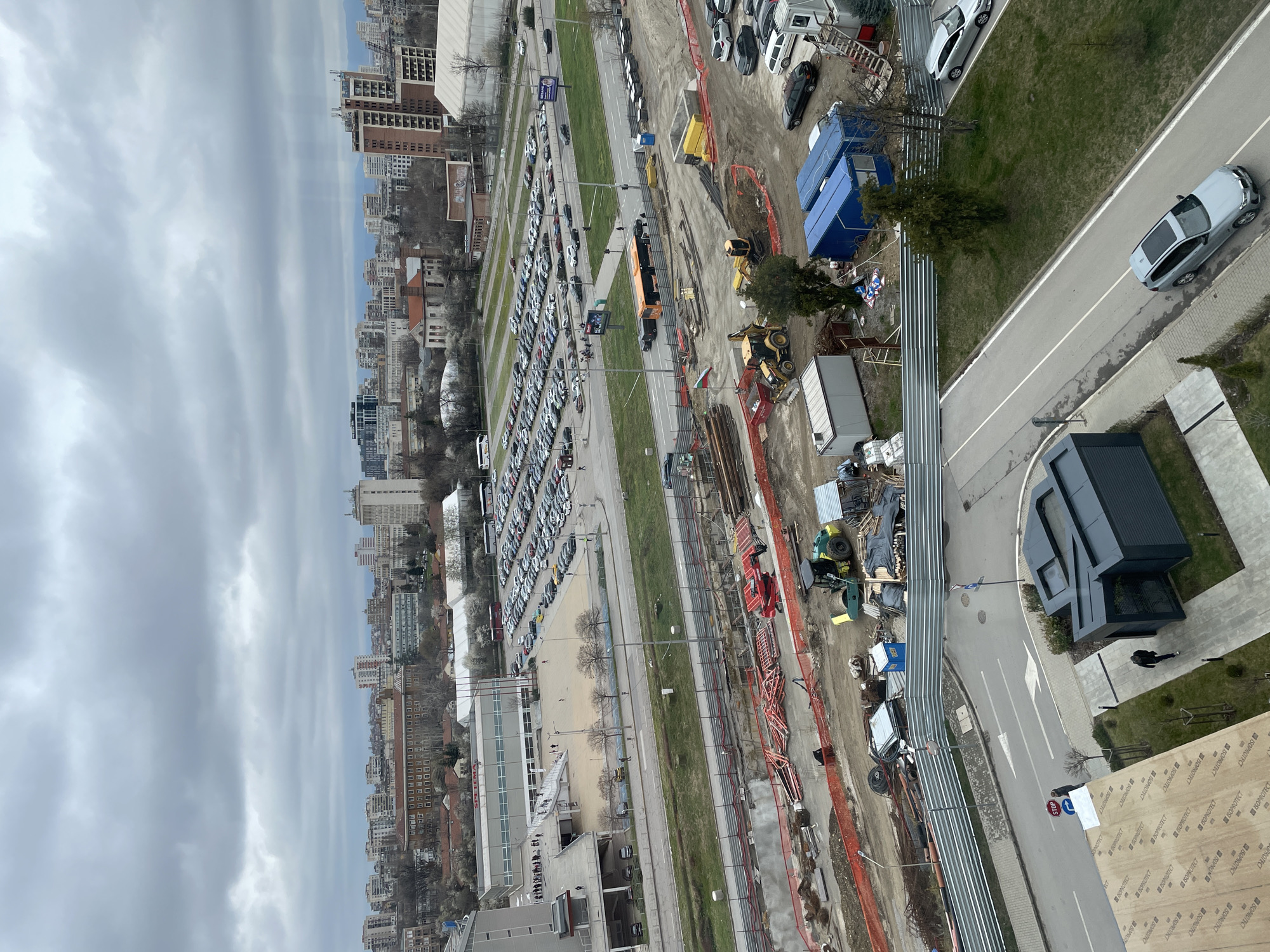 The image presents an elevated view of a section in Sofia, Bulgaria, characterized by urban development and construction activity. The cityscape extends into the horizon under a cloudy sky, marked by residential and commercial buildings. In the midground, a large parking area is filled with numerous vehicles. Adjacent to the parking lot is a construction site where heavy machinery is present and materials are stacked, indicating ongoing building operations. A street runs alongside this site, accommodating vehicular traffic. The immediate foreground shows building materials and potentially the roof of the building from which the photograph was taken. Pedestrians are visible in the background.